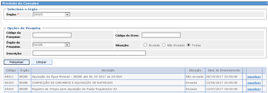 • Inclusão de opções de pesquisa como: código da pesquisa, órgão da pesquisa, descrição, código do item e situação.