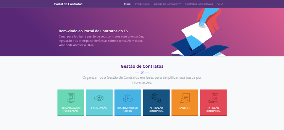 A Secretaria de Estado de Gestão e Recursos Humanos (Seger) lança o Portal de Contratos do Governo do Estado do Espírito Santo – www.contratos.es.gov.br, que já está disponível para acesso. O canal foi desenvolvido a partir de uma parceria da Gerência de Gestão de Contratos e Convênios (GECOV), com o Laboratório de Inovação na Gestão (Labges) e o Instituto de Tecnologia da Informação e Comunicação do Espírito Santo (Prodest).